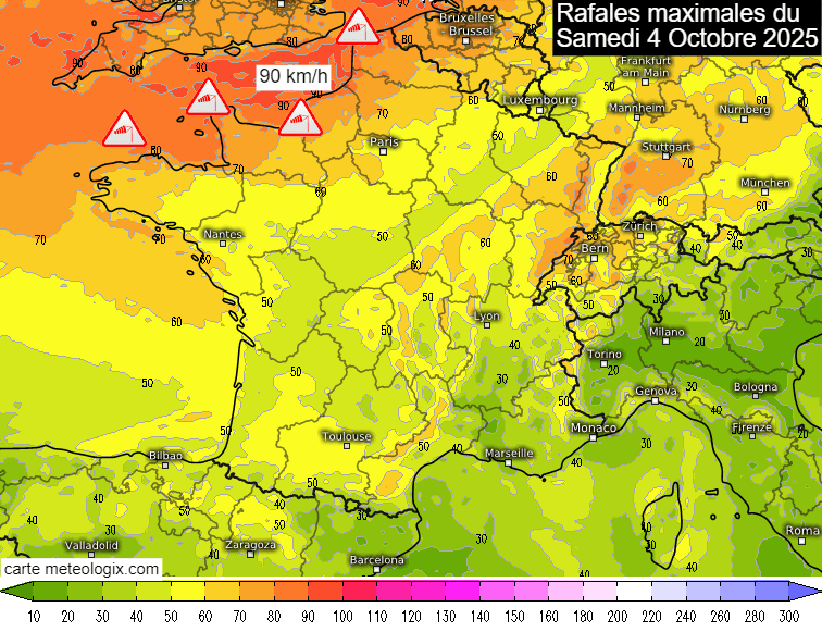 Rafales de vent maximales prévues en France le samedi 4 octobre 2025 - meteologix.com