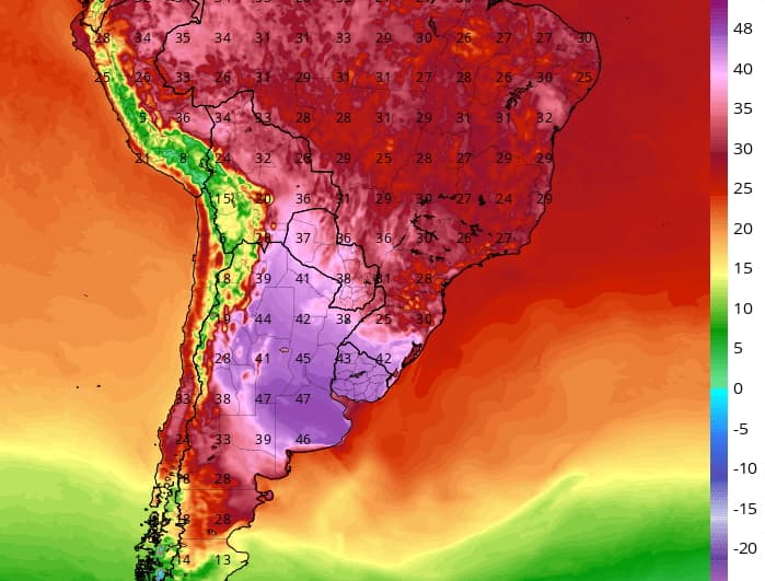 Les températures s'affolent le début de la deuxième décade du mois de janvier 2022 sur le continent sud-américain, particulièrement sur l'Argentine, l'Uruguay, le Paraguay et le sud du Brésil. Le 11 janvier dernier, le thermomètre a atteint 41,1°C à Buenos Aires, capitale argentine. Il s'agit de la deuxième valeur la plus élevée de la ville depuis le début des relevés en 1906 ! Dans les terres, des valeurs de 45 à 47°C ont été enregistrées localement ces derniers jours, des niveaux 15°C au dessus des normales !