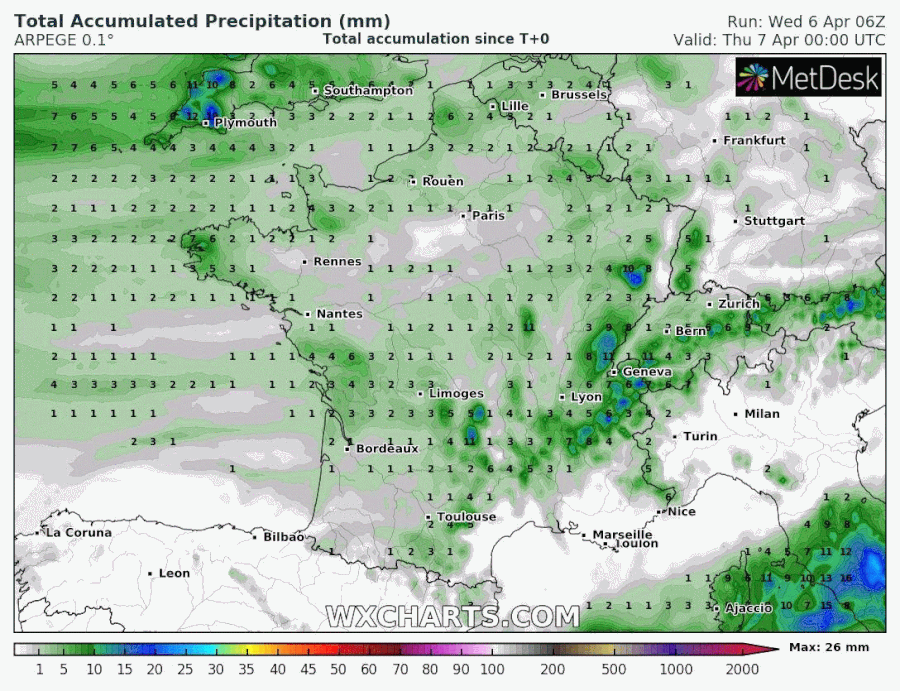 Modélisation des cumuls de pluie les jeudi 7 et vendredi 8 avril 2022 - via wxcharts.com