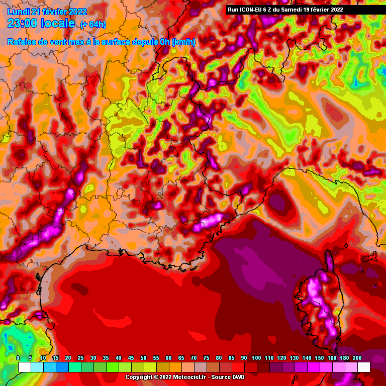 Rafales maximales modélisées dans le quart Sud-Est - lundi 21 février 2022 - Modèle ICON-EU via Météociel