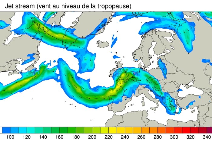 Jet stream le lundi 5 juillet 2021 à 20h - modèle GFS via infoclimat.fr