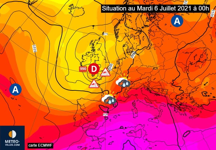 Situation à échelle continentale le mardi 6 juillet 2021 à 00h - via ECMWF