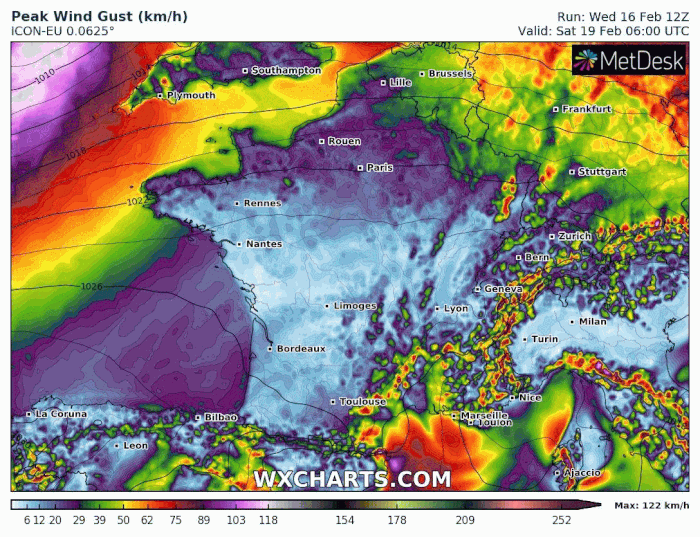 Modélisation des rafales de vent les samedi 19 et dimanche 20 février 2022 - via wxcharts.com