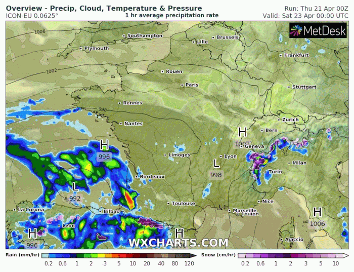 Modélisation des précipitations les samedi 23 et dimanche 24 avril 2022 - via wxcharts.com