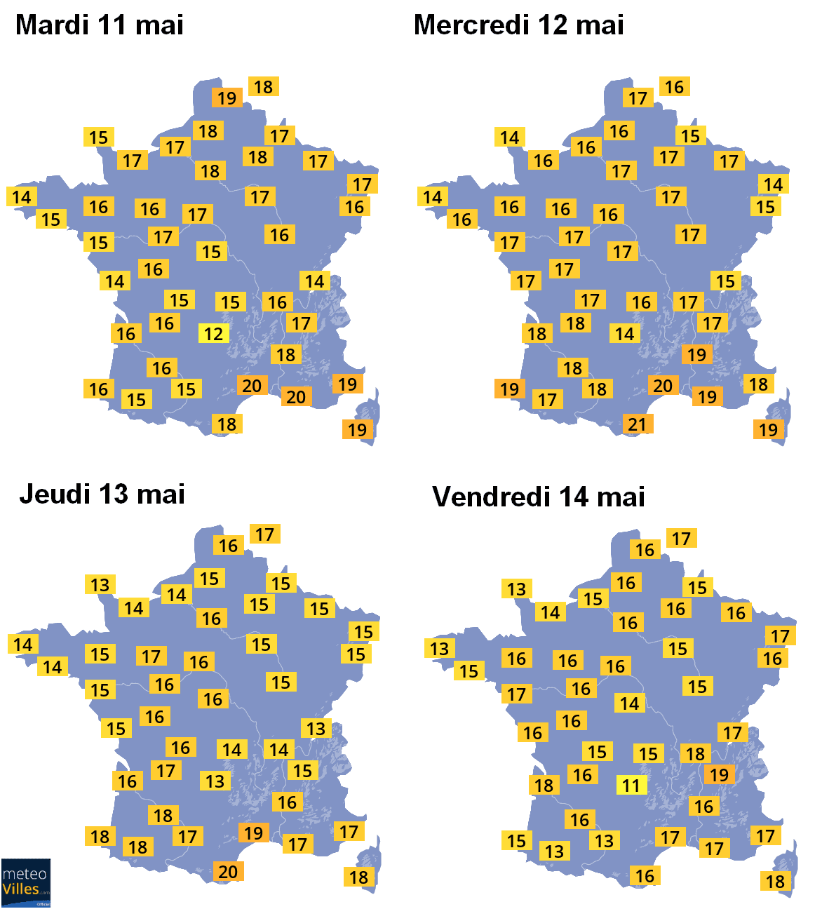 Températures maximales envisagées sur la France du mardi 11 au vendredi 14 mai 2021 – Météo-Villes