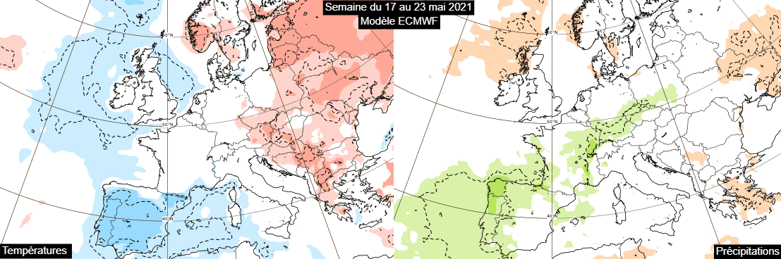 Anomalies de températures et de précipitations durant la semaine du 17 au 23 mai 2021 – Modèle ECMWF