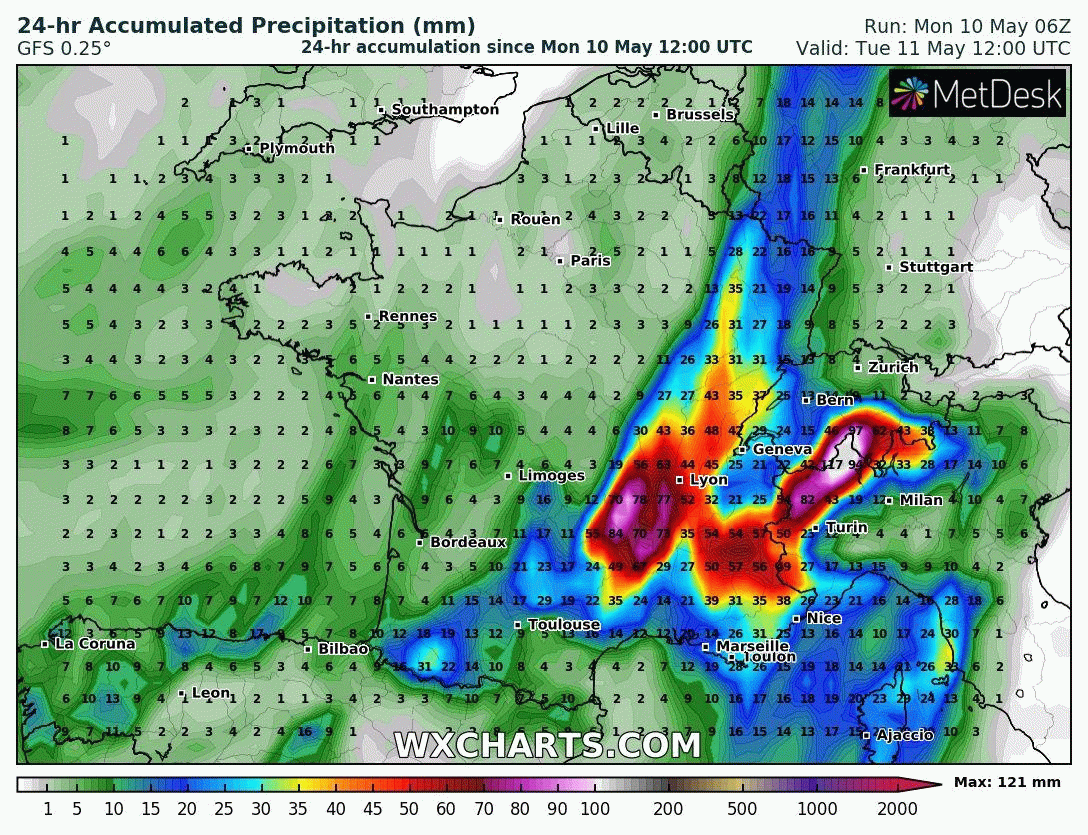 Animation des cumuls de précipitations journaliers du 11 au 17 mai 2021 sur la France – modèle GFS via WX CHARTS