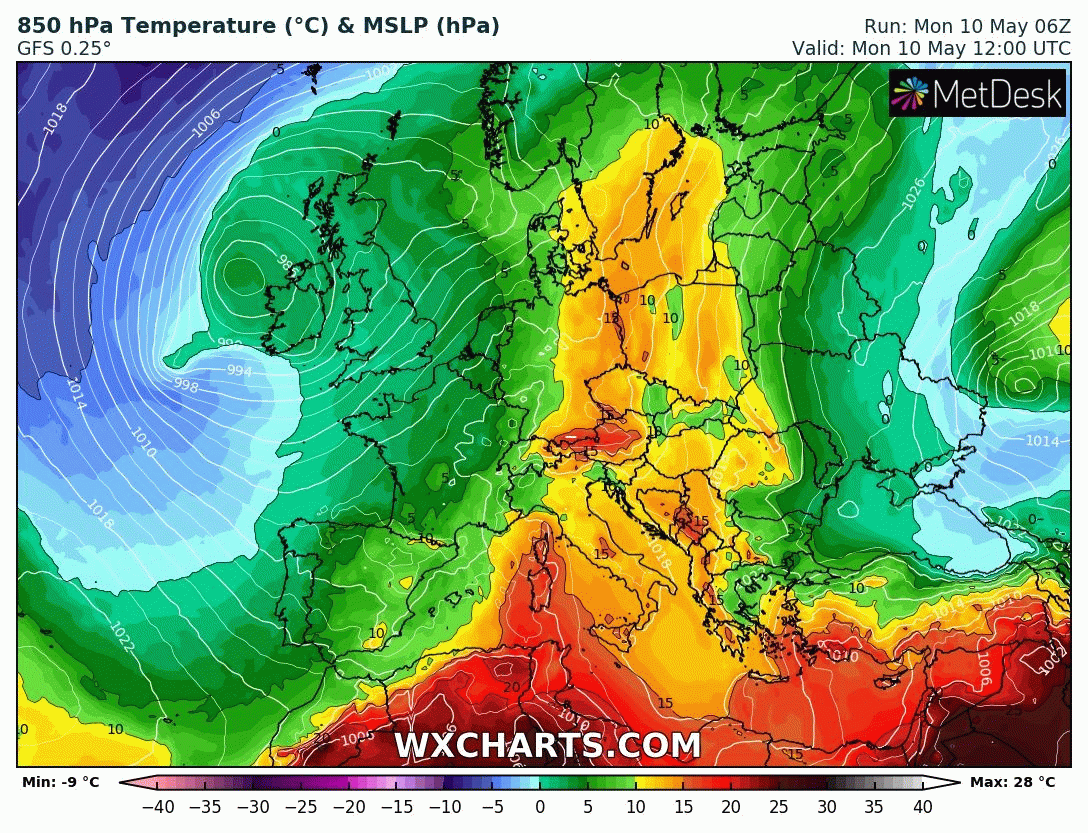 Animation des températures à 850 hPa sur l’Ouest de l’Europe du lundi 10 au samedi 15 mai 2021 – Modèle GFS via WX CHARTS