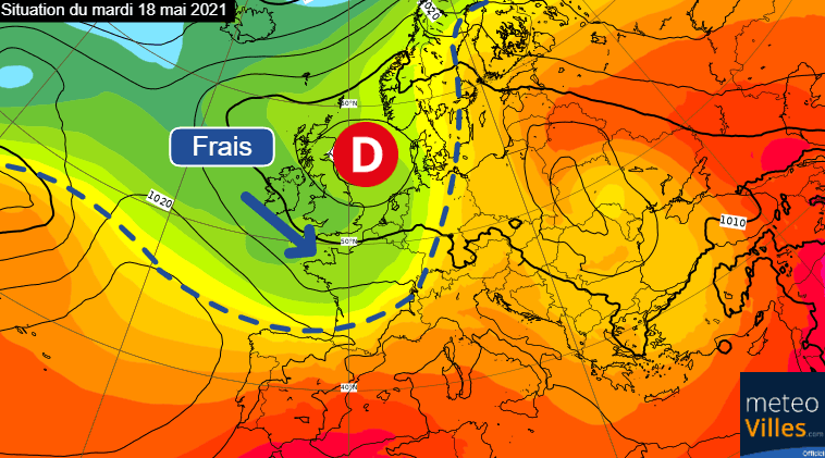 Situation atmosphérique sur l’Ouest de l’Europe envisagée le mardi 18 mai 2021 – ECMWF, modifié par Météo-Villes