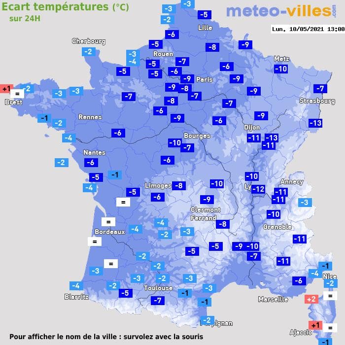 Ecarts de températures en 24h sur la France ce lundi 10 mai 2021 – Météo-Villes
