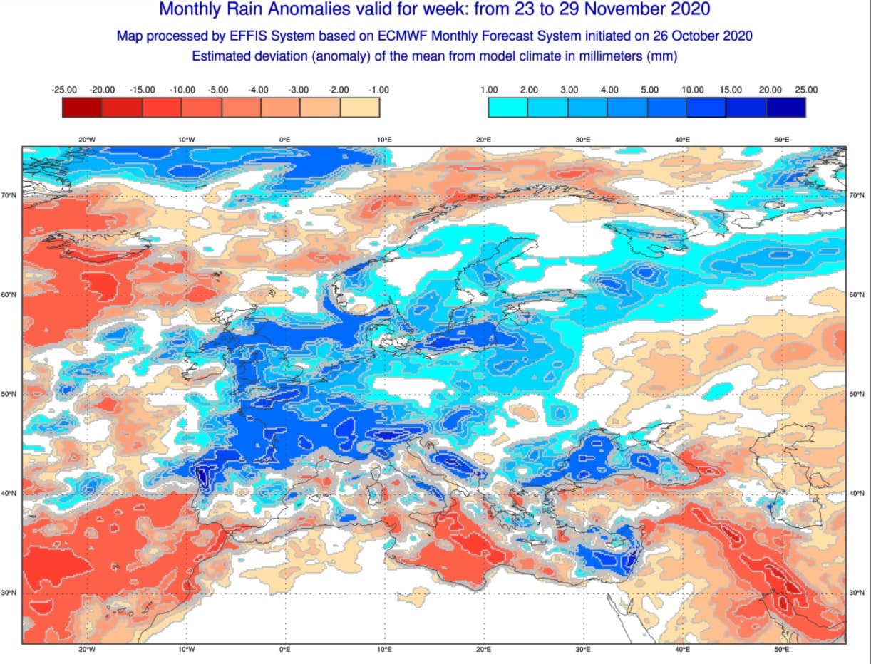 Anomalies de précipitations sur l'Ouest de l'Europe durant la semaine du 23 au 29 Novembre - Modèle ECMWF via EFFIS