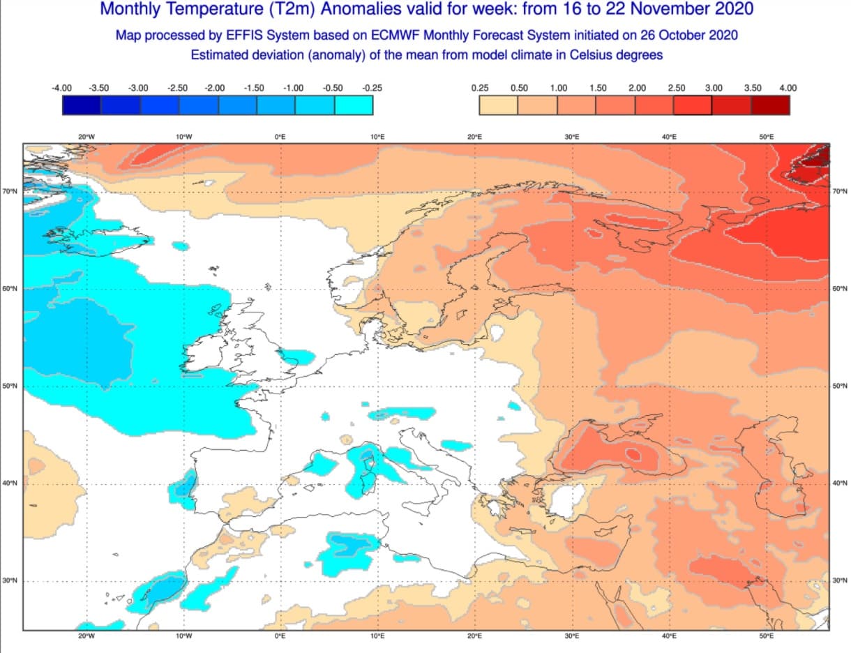 Anomalies de températures sur l'Ouest de l'Europe durant la semaine du 16 au 22 Novembre - Modèle ECMWF via EFFIS