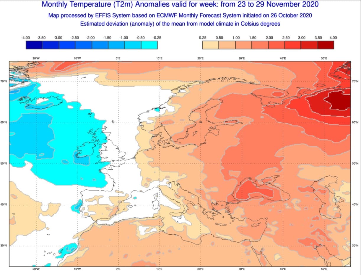 Anomalies de températures sur l'Ouest de l'Europe durant la semaine du 23 au 29 Novembre - Modèle ECMWF via EFFIS