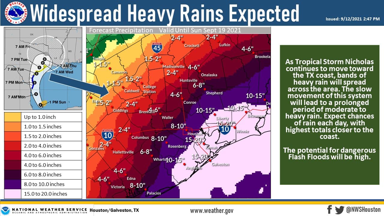 Cumuls (en Inches) prévus sur le Sud du Texas d'ici le dimanche 19 septembre 2021 – NWS