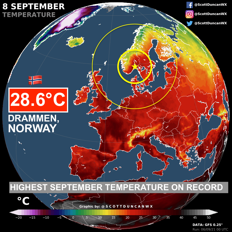 Record de chaleur national mensuel en Norvège ce 8 septembre 2021 – Via Scott Duncan