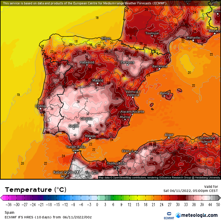 Ce dôme de chaleur en altitude apportera donc la première canicule de l'année 2022 sur la péninsule ibérique dès ce week-end, perdurant ensuite jusqu'en cours de semaine prochaine. C'est notamment entre le Sud de l'Espagne et le Sud du Portugal que les valeurs les plus élevées devraient être observées. Ce vendredi 10 juin fut déjà caniculaire sur ces secteurs avec jusqu'à :