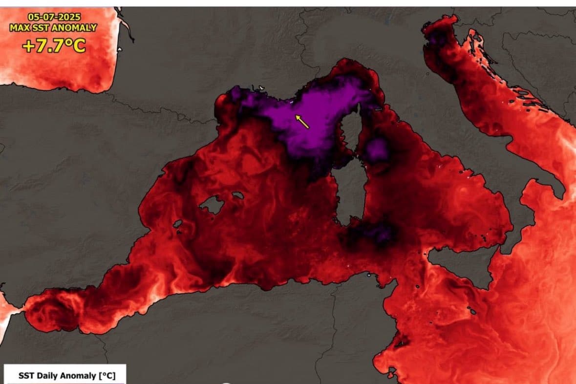 Anomalies de températures de la surface de la mer Méditerranée le 5 juillet 2025 – Via Twitter @PGDynes
