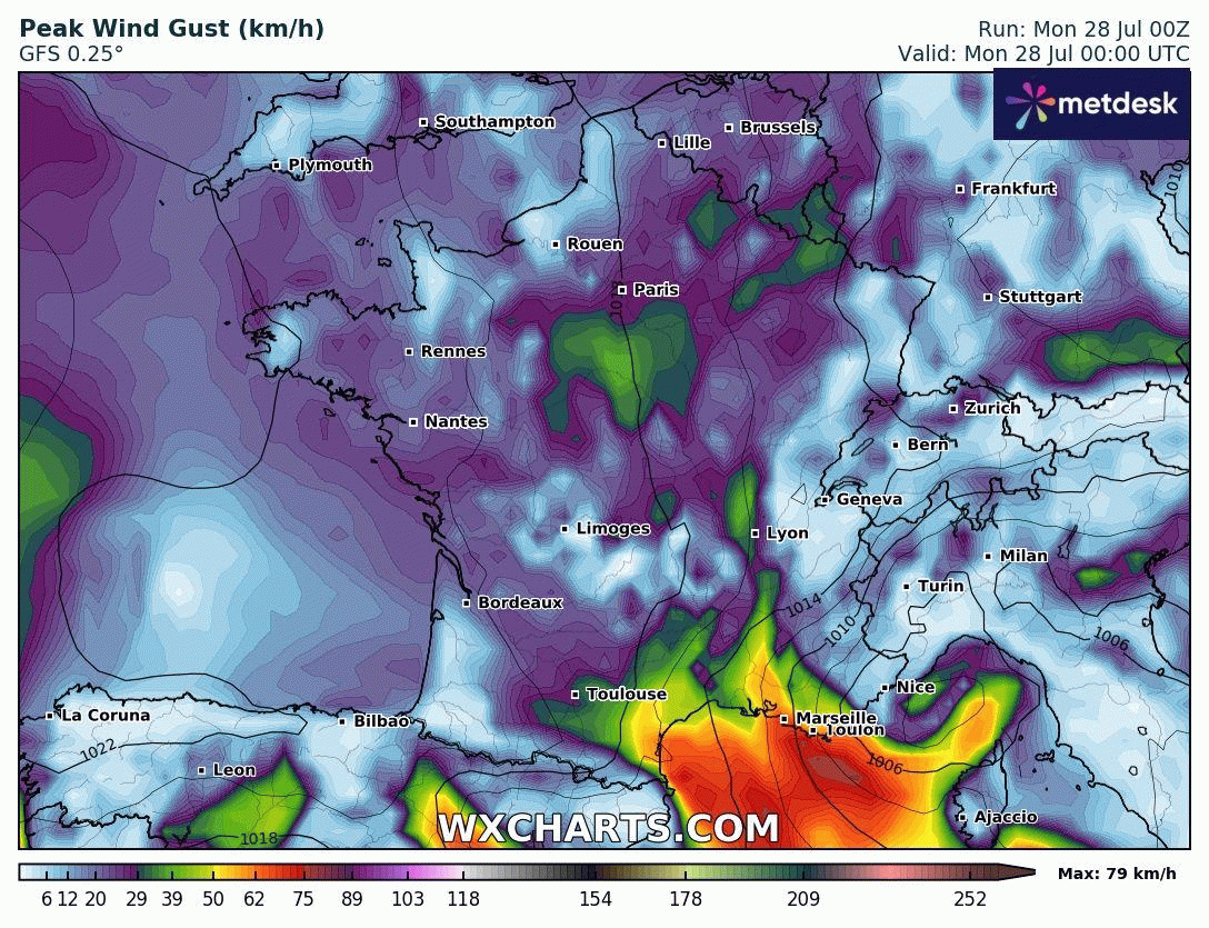 Animation des rafales de vent du 28 juillet au 3 août 2025 – Modèle GFS via WX CHARTS
