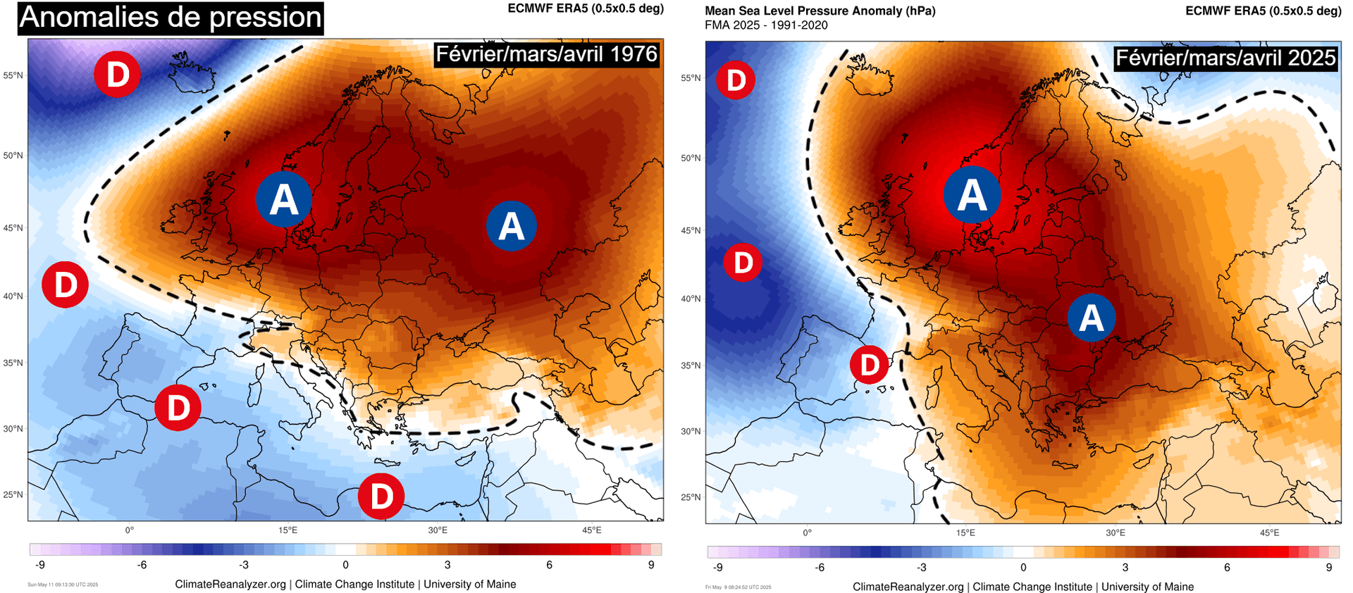 Comparaison des anomalies de pression durant le trimestre février/mars/avril 1976 et 2025 – Via ClimateReanalyzer