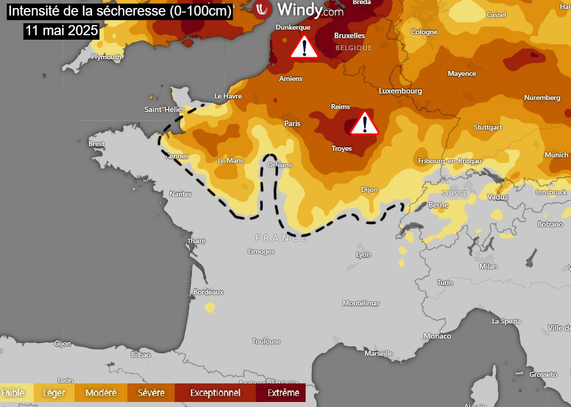 Intensité de la sécheresse des sols sur la France au 11 mai 2025 – Via Windy.com