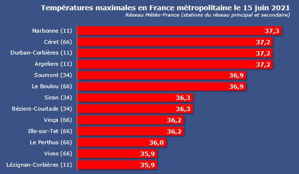 Cette journée du 13 juin fut provisoirement la plus chaude de cette année 2021, et les températures maximales observées sont également les plus élevées de l'année. Le département des Pyrénées-Orientales truste le haut du classement avec 37.8°C à Céret et 37.7°C au Boulou. Notons également les 37.1°C sur l'aéroport de Perpignan-Rivesaltes qui se place au second rang des valeurs les plus élevées jamais enregistrées sur cette station en juin (ouverte en 1924), derrière l'invraisemblable après-midi du 28 juin 2019 (42.4°C).