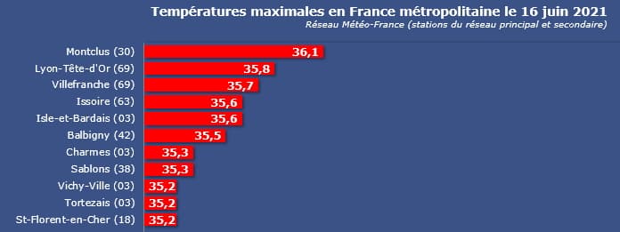 Plus des deux tiers des stations de Météo France ont dépassé le seuil des 30°C en après-midi du 16 juin 2021. En revanche, le dépassement du seuil des 35°C était rare, concernant moins de 1% des stations. On a relevé jusqu'à 36,1°C à Montclus dans le Gard. C'est dans le centre-est que les valeurs étaient généralement les plus élevées avec 35,8°C au Parc de la Tête d'Or de Lyon ou encore 35,7°C à Villefranche. En Auvergne, on notait 35,6°C à Issoire (63) et à Isle-en-Bardais (03).