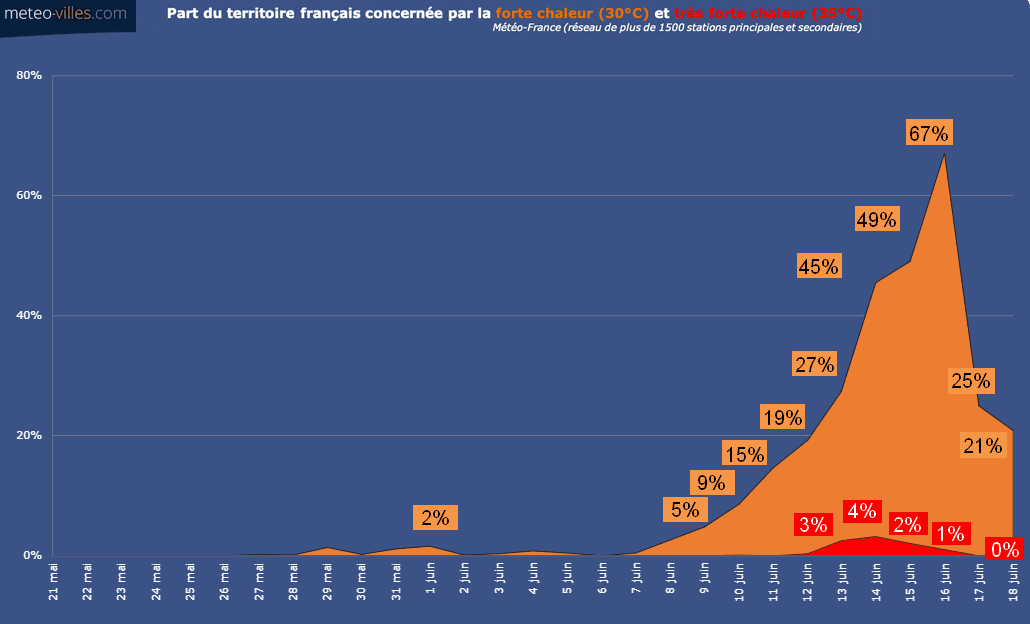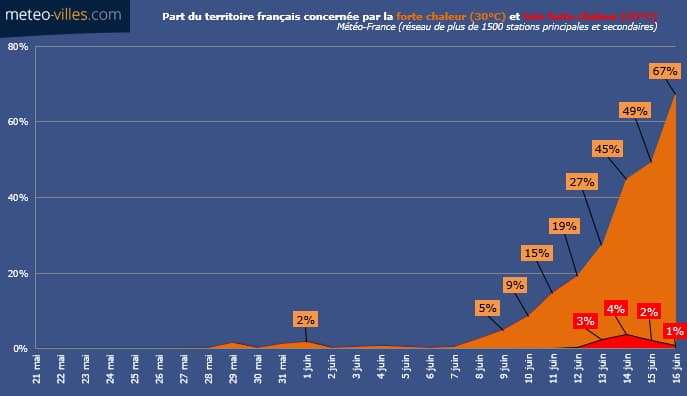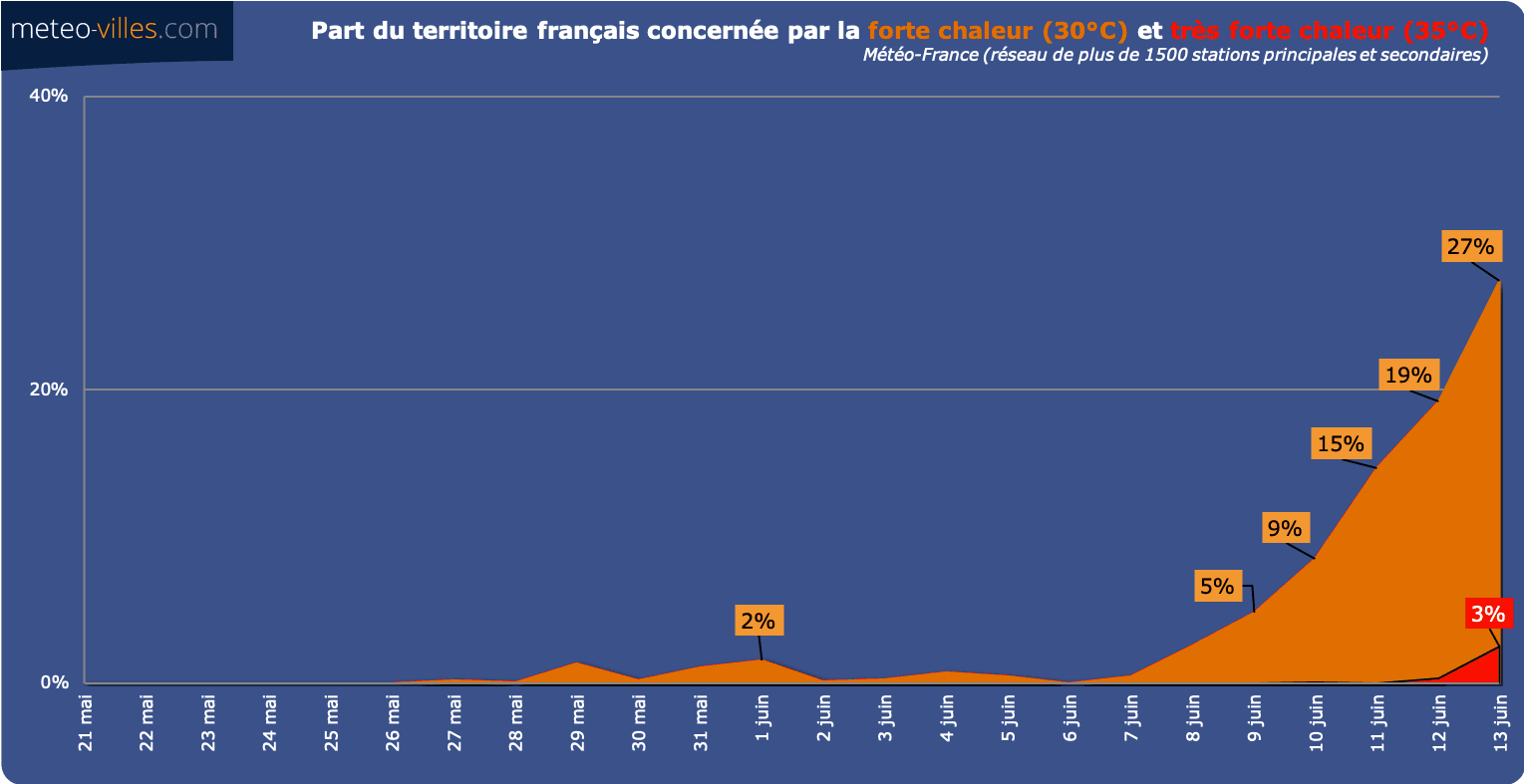 Lors de la journée du 13 juin, 27% des stations météorologiques du territoire ont dépassé le seuil de chaleur (30°C) principalement sur le pourtour Méditerranéen et dans le Sud-Ouest, et 3% ont atteint les 35°C (seuil de très forte chaleur).