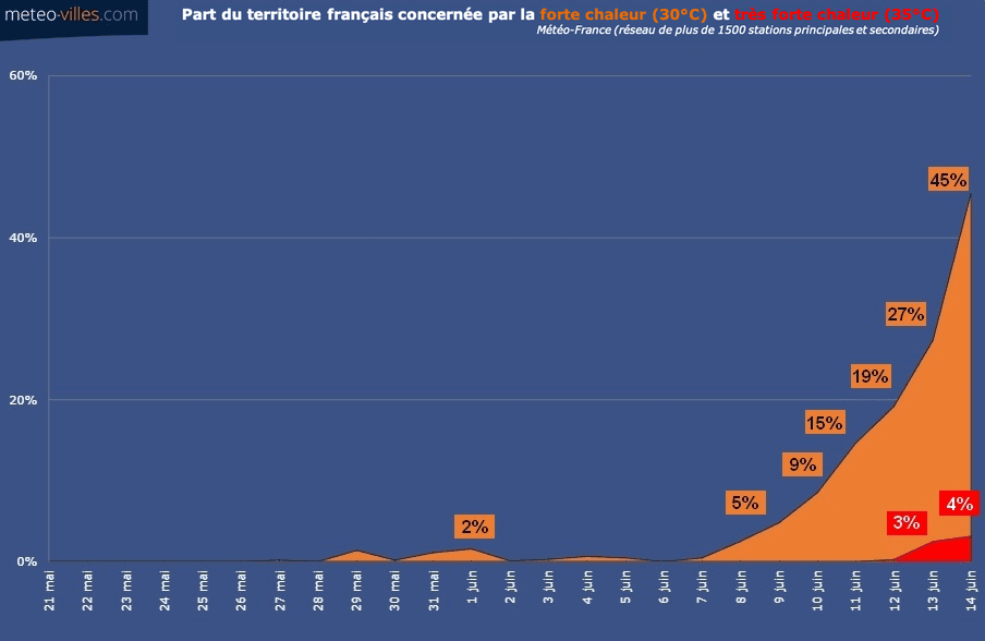 Ce lundi 14 juin, celui-ci a été atteint sur 45% des stations du territoire, notamment entre la Méditerranée, le Sud-Ouest, le Centre et les Pays de la Loire. Le seuil de très fortes chaleurs (35°C) à quant à lui été atteint sur 4% des stations du réseau Météo-France.