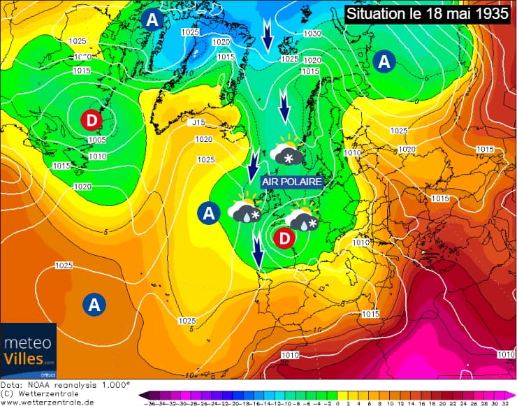 Situation à échelle continentale le 18 mai 1935 - archives NOAA via wetterzentrale