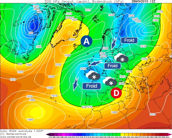 En 2010, il n'aura pas fallu attendre l'arrivée de l'hiver météorologique pour que les conditions hivernales ne s'installent en France. Dès la fin du mois de novembre, un blocage anticyclonique se met en place vers l'Islande et la Mer du Nord tandis que les dépressions circulent vers l'Italie, dirigeant un flux de nord à nord-est bien froid et humide, dont les racines nous amènent un air venu de Scandinavie et de l'ouest de la Russie.