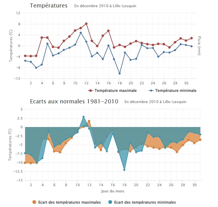 Si les températures ont été tantôt froides, tantôt douces dans le sud de la France au cours du mois de décembre 2010, les régions du nord ont enregistré des températures constamment hivernales du début jusqu'à la fin du mois ! C'est sur l'extrême nord du pays que les anomalies mensuelles sont les plus prononcées, en faisant le mois le décembre le plus froid mais aussi le plus neigeux des 40 dernières années ! À Lille, les températures n'atteignent jamais les normales, à l'exception des 11 et 12 décembre 2010.