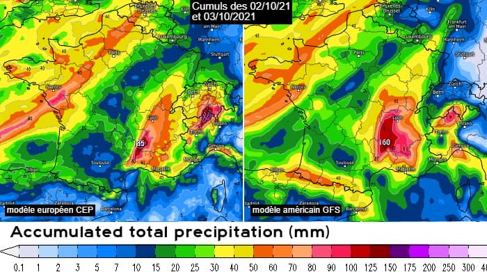 Certaines modélisations sont alarmantes dans le sud-est avec un axe de pluies abondantes qui se positionnerait sur les Cévennes et la vallée du Rhône. Des cumuls de 200 à 300 mm sont possibles sur l'est du massif des Cévennes, notamment entre les Cévennes gardoises, lozériennes et ardéchoises.