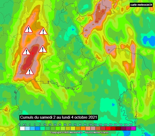 Modélisations des cumuls de pluie du samedi 2 au lundi 4 octobre 2021 au matin - via meteologix.com