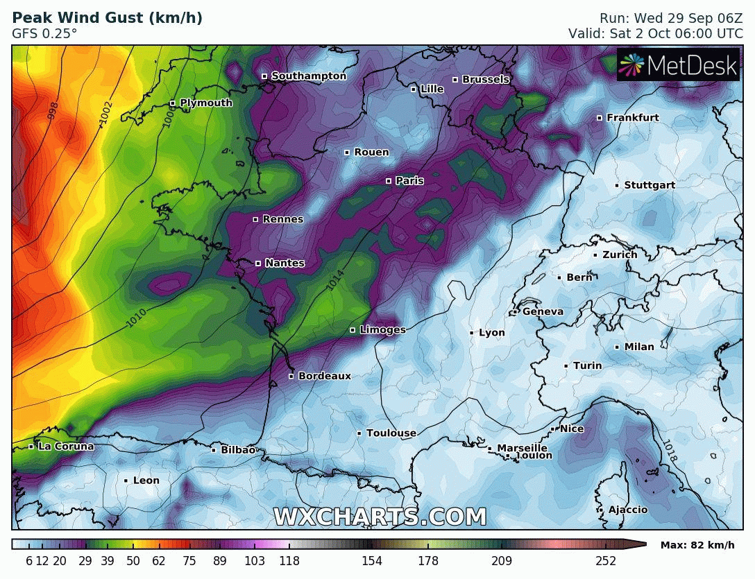 La creusement de la dépression sur l'ouest des Îles Britanniques devrait générer un épisode pluvio-venteux sur le nord-ouest de la France dès l'après-midi du samedi 2 octobre 2021 et jusqu'en nuit suivante. Ensuite, l'approche de cette dépression va générer une accélération du flux de sud sur les régions de l'est durant la journée du dimanche 3 octobre 2021, comme l'illustre l'animation ci-dessus.