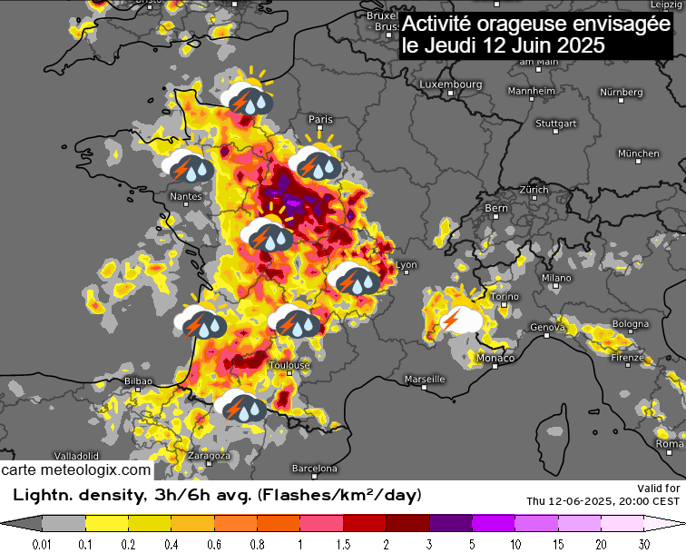 Densité de foudroiement envisagée pour le jeudi 12 juin 2025 - meteologix.com