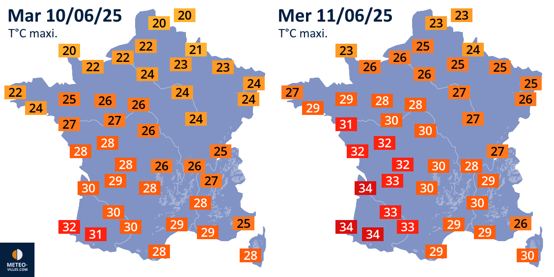 Températures maximales prévues les mardi 10 et mercredi 11 juin 2025 - Météo Villes