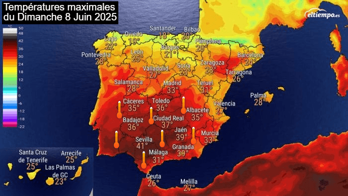 Avant de gagner la France, cet air chaud remontera sur l'Espagne où il s'accumulera à partir de ce week-end. Dès la journée du dimanche 8 juin 2025, la barre des 40°C devrait être franchie dans le sud du pays. Les services météo espagnols annoncent 41°C à Séville en après-midi du dimanche 8 juin 2025 !