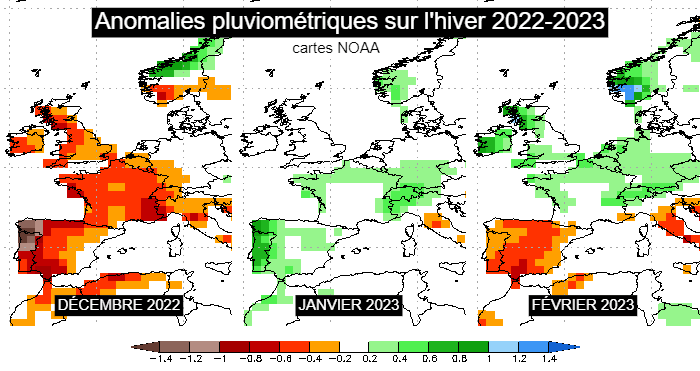 Anomalies pluviométriques mensuelles pour l'hiver 2022-2023 - modèle européen via ECMWF