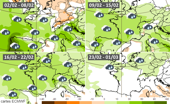 Anomalies pluviométriques hebdomadaires au cours du mois de février 2026 - ECMWF
