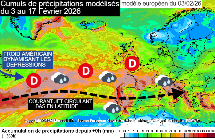 Ainsi, la situation qui dominait en janvier semble vouloir se prolonger en février 2026 avec un courant jet circulant à des latitudes plus basses qu'en temps normal, passant par les Açores puis la péninsule ibérique avant d'atteindre la Méditerranée. De plus, l'air polaire présent sur le nord de l'Amérique dynamise l'activité dépressionnaire sur l'Atlantique, lorsque cet air froid arrive au dessus de l'océan. Ainsi, tous les ingrédients sont réunis pour un défilé de perturbation sur la France, le Portugal, l'Espagne ou encore l'Italie, où les modèles projettent d'importantes quantités de pluie ces prochaines semaines.