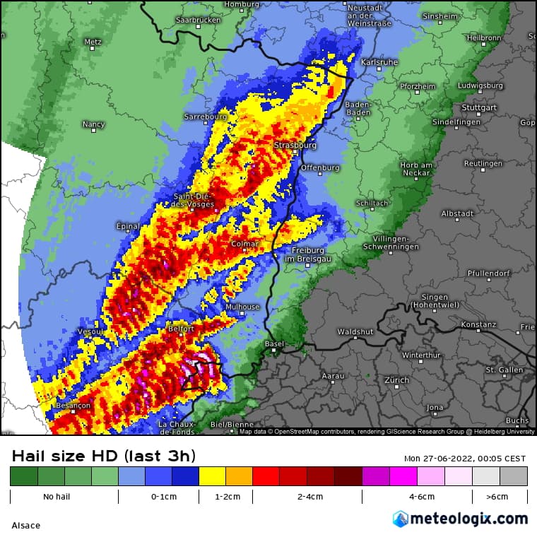Gros grêlons au sud-ouest de Strasbourg (67) en soirée du dimanche 26 juin 2022 - via ATMORISK