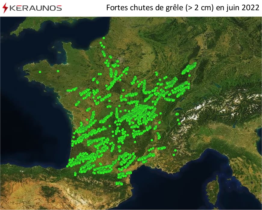 Cas de chutes de grêle au diamètre supérieur à 2 cm en France en juin 2022 - carte Keraunos