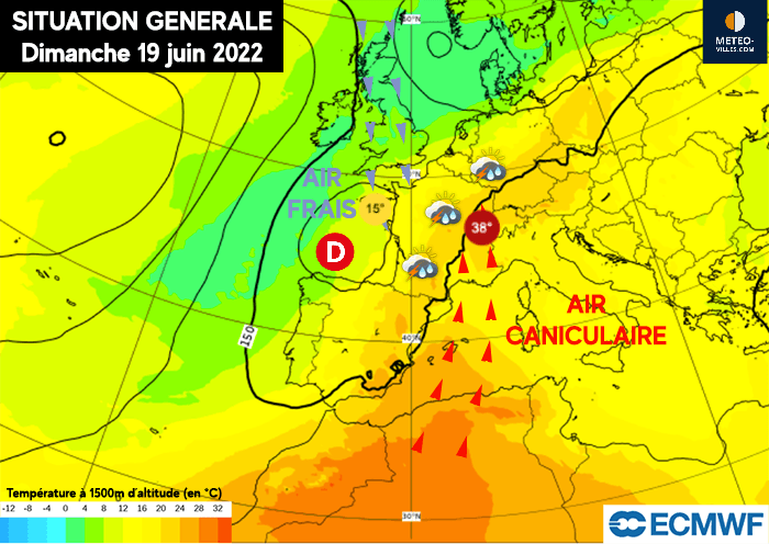 Situation générale sur l'Europe de l'Ouest - dimanche 19 juin 2022 - Fond de carte ECMWF
