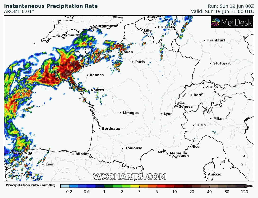Animation des précipitations prévues - dimanche 18 juin 2022 (et nuit suivante) - Modèle Arome via WxCharts
