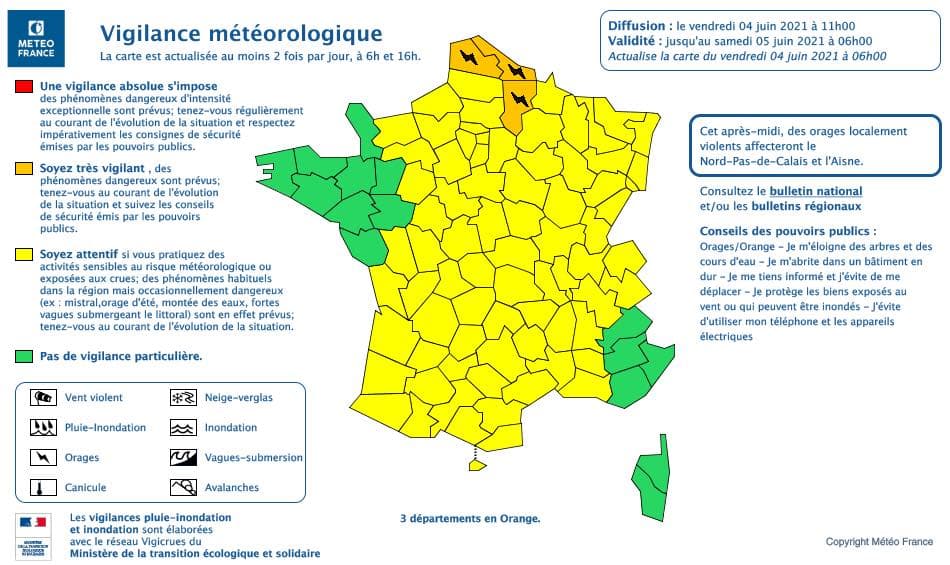 Carte de vigilance du vendredi 4 juin 2021 à 11h – Météo-France